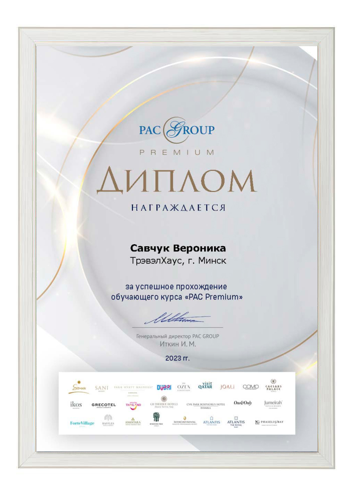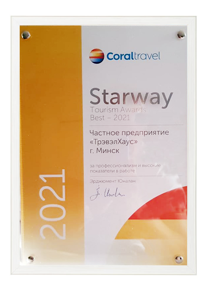 Сертификат соответствия № BY/112 04.03. 071.01 00109 выдан ГУ «Национальное агентство по туризму» Министерства спорта и туризма Республики Беларусь. Компания Travel House прошла добровольную сертификацию услуг. Ежегодно аудиторы ГУ «Национальное агентство по туризму» проверяют офисы продаж, уровень квалификации специалистов компании, внутреннюю документацию, договоры оказания туристических услуг, стандарты работы и подтверждают соответствие услуг компании актуальным требованиям Закона о туризме и другому законодательству Республики Беларусь.